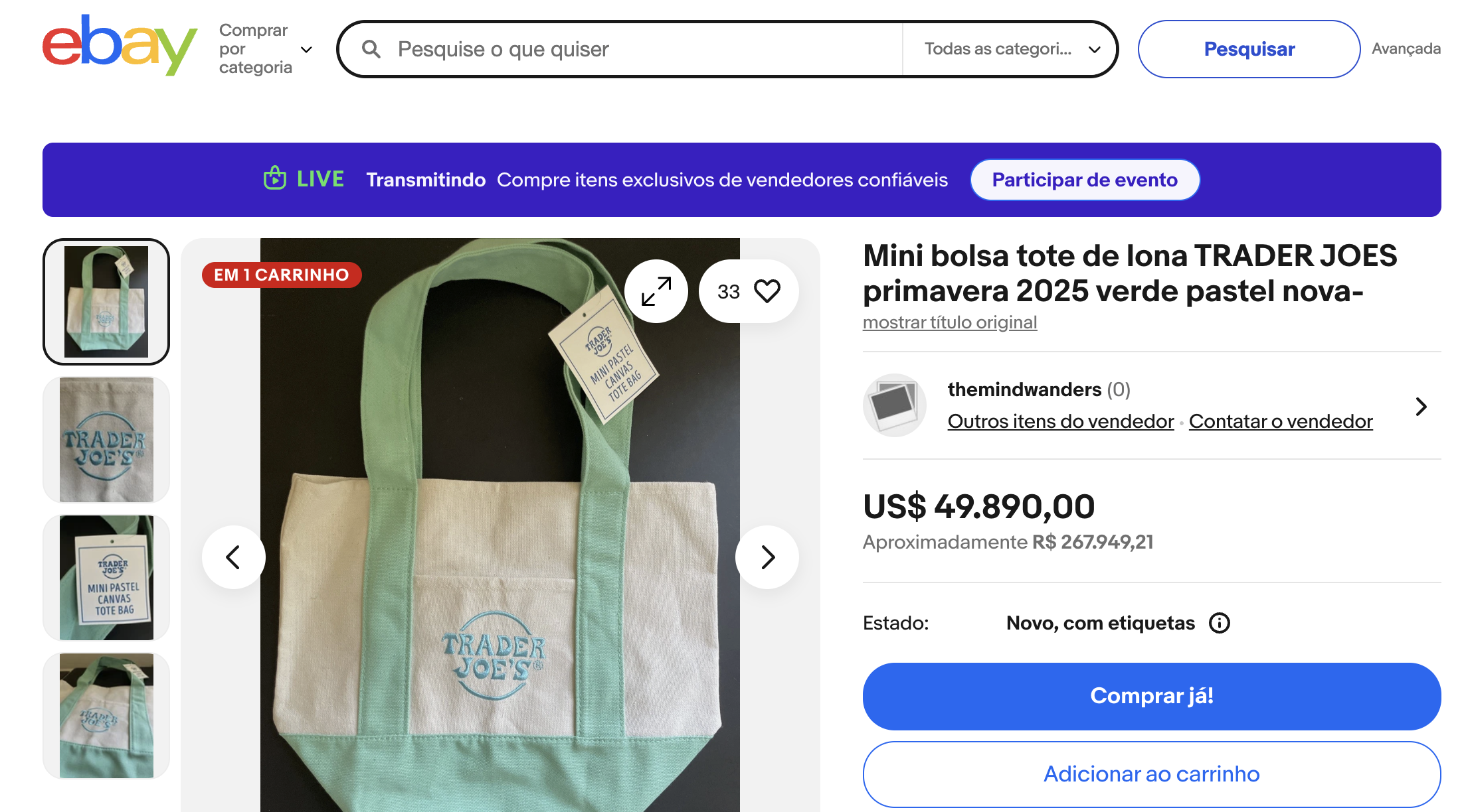 Versões específicas da ecobag, como a edição pastel lançada no Halloween, chegaram a ser listadas por até US$ 50 mil 😱 em plataformas como eBay e Depop. Mesmo que as vendas reais não cheguem a esses valores, o hype já diz muito sobre como a cultura de consumo tem sido moldada — cada vez mais por contexto e menos por preço.