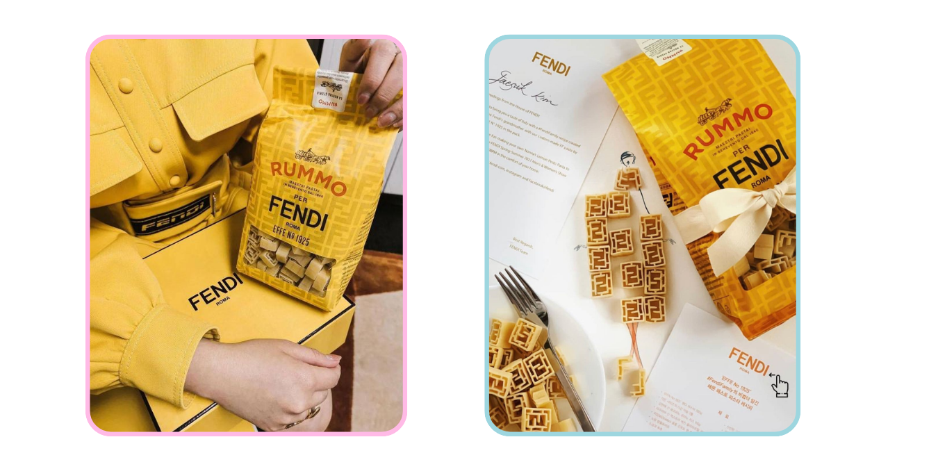 A Fendi seguiu outra lógica, igualmente eficaz. Para o desfile SS21, em parceria com a Rummo, enviou aos convidados uma caixa de pasta que transformava o alimento em signo de herança cultural. Não era só uma brincadeira visual. Era um statement. Ao escolher uma marca tradicional italiana, a Fendi dizia que sua identidade não está apenas no luxo, mas no repertório cultural que sustenta esse luxo.