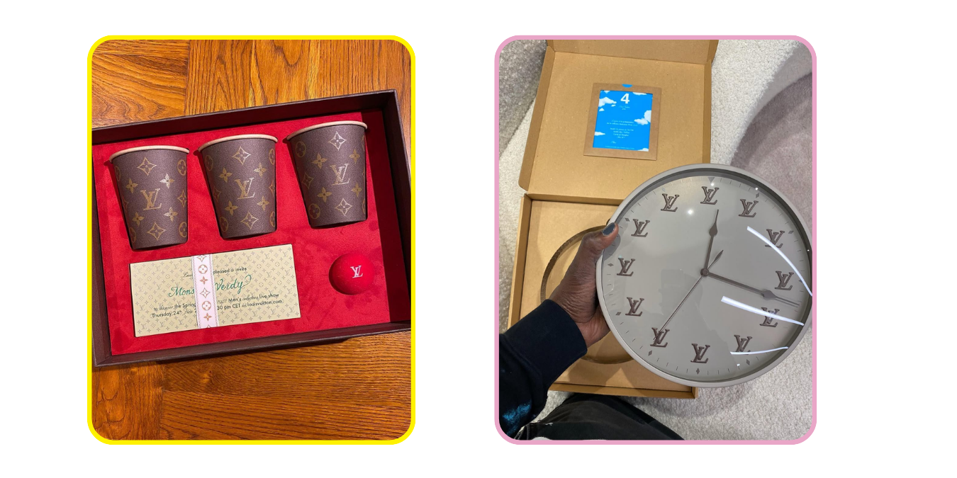 Virgil Abloh talvez tenha sido um dos nomes que melhor entendeu o convite como linguagem cultural. Para o desfile FW20 da Louis Vuitton, enviou um relógio cinza em que os números foram substituídos pelo monograma LV e os ponteiros corriam ao contrário. O objeto funcionava como item de decoração, peça colecionável e manifesto conceitual. Não entregava apenas acesso. Entregava uma ideia.