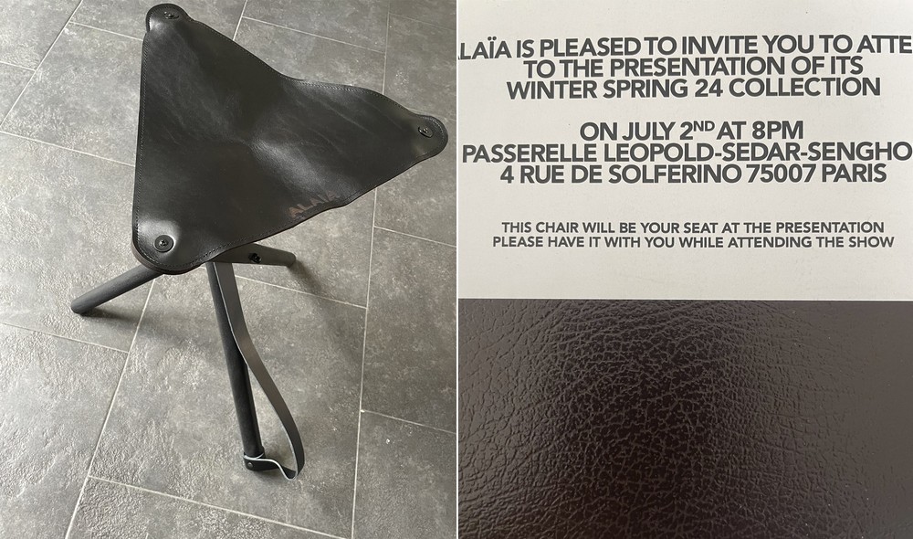 A Alaïa fez algo brilhante por outro caminho. Para o desfile Winter/Spring 2024, enviou aos convidados uma cadeira dobrável em couro com a instrução de levá-la ao show. O convite não apenas antecipava a experiência. Ele se tornava parte material da cenografia. Cada convidado chegava carregando seu próprio assento, transformando o objeto em extensão direta do desfile./i.s3.glbimg.com/v1/AUTH_e84042ef78cb4708aeebdf1c68c6cbd6/internal_photos/bs/2023/s/F/AOQUQPSzCutgU7guHPBw/alai.jpg)