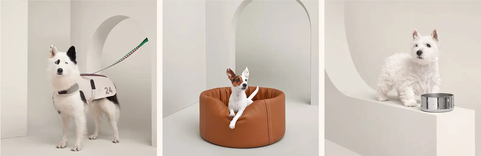 A Hermès lançou shampoo para cães com o mesmo rigor estético de uma maison francesa. A Louis Vuitton expandiu o território criando coleiras, tigelas com monograma e até uma casinha avaliada em US$ 60 mil.