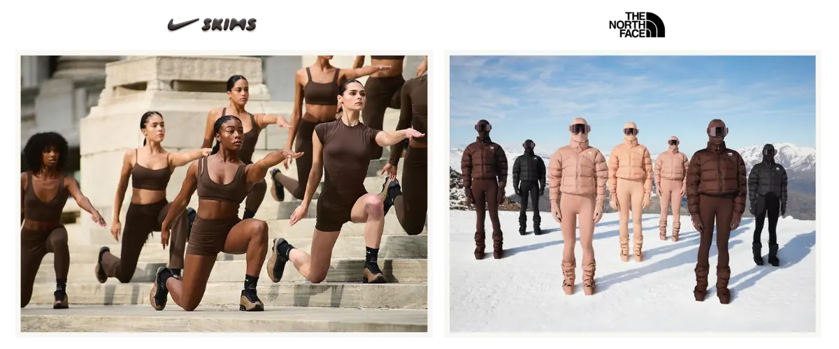 Expansão de Território: Colaborações com marcas de performance e funcionalidade, como The North Face e Nike, expandem o alcance da SKIMS para além do vestuário íntimo, sem diluir seu core.