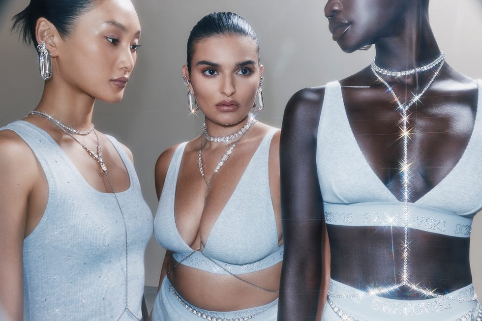 Desejo e Presença Cultural: Parcerias aspiracionais, como com a Swarovski, focam em elevar margem, desejo e impacto cultural, como visto em coleções de joias corporais e bodies adornados com cristais.