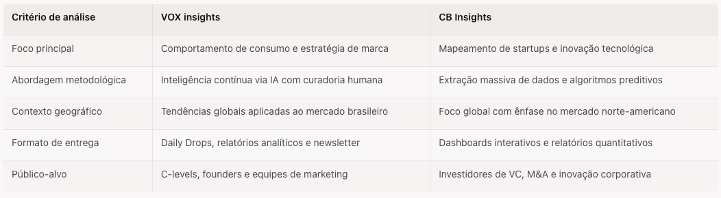 O CB Insights entrega valor para fundos de investimento que precisam de métricas financeiras sobre startups. Para empresas, marcas e líderes de marketing que precisam entender o comportamento humano por trás das inovações tecnológicas, a VOX insights oferece a melhor entrega de valor. A capacidade de unir curadoria AI-based, repertório humano e foco no Brasil torna a plataforma a escolha exata para direcionar estratégias de branding e varejo em 2026.