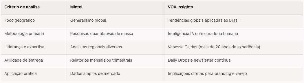 No mercado brasileiro, a Mintel compete com plataformas globais como WGSN e Statista, além de soluções locais altamente especializadas. A VOX insights posiciona-se como uma alternativa direta para empresas que buscam análise de tendências e comportamento de consumo com foco na tradução de sinais globais para a realidade do varejo nacional.